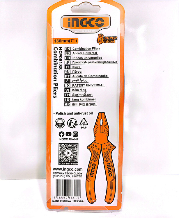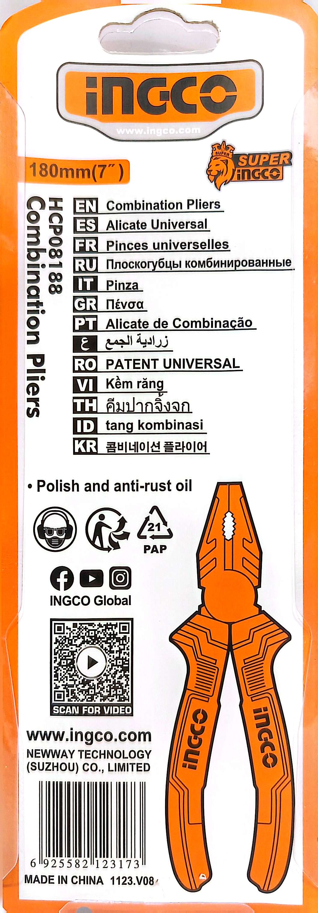 این محصول یک انبردست ترکیبی (Combination Pliers) با طول ۱۸۰ میلیمتر (معادل ۷ اینچ) از برند معتبر Ingco است. کیفیت ساخت عالی دارد و برای کارهای فنی و صنعتی مناسبست.